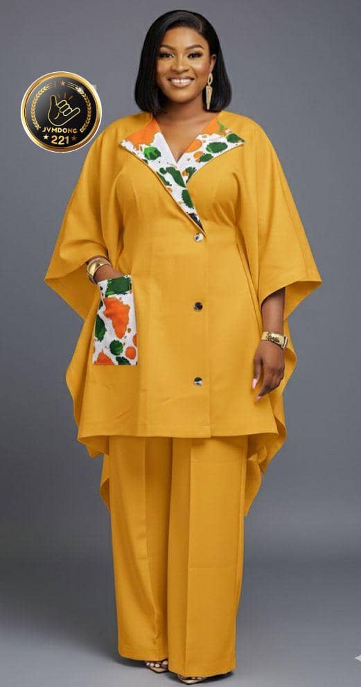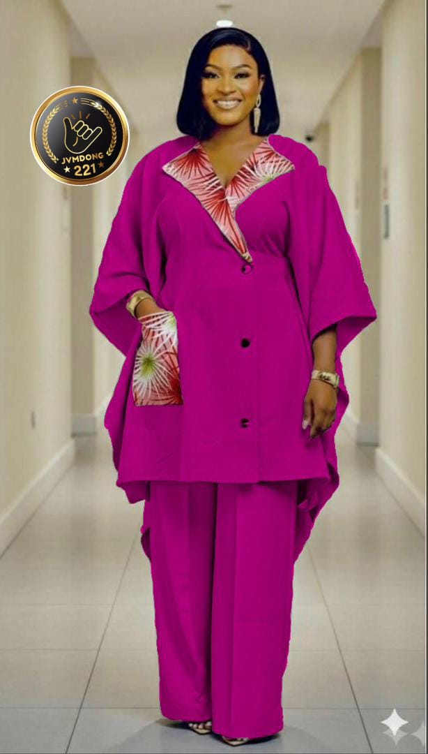 Composé d’une tunique fluide à manches larges et d’un pantalon ample assorti, cet ensemble offre un confort absolu tout en mettant en valeur la silhouette. Les détails en tissu imprimé au niveau du col et de la poche apportent une note authentique et tendance qui fait toute la différence.