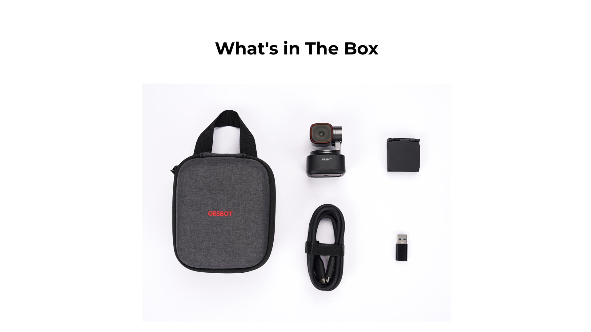 | Le produit comprend | 1″ OBSBOT Tiny 2 1″ Câble USB-C 3.0 et adaptateur USB-C vers USB-A 3.0 1″ Support réglable OBSBOT Tiny 2 1″ Étui pour OBSBOT Tiny 2 |